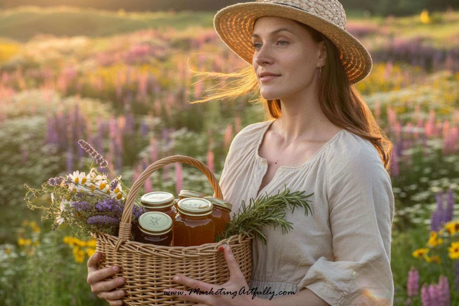 Your products should reflect a cozy, nature-loving lifestyle. Think handmade soaps, wax seals with bee motifs, wildflower stickers, gingham printables, and digital wall art with gentle quotes.