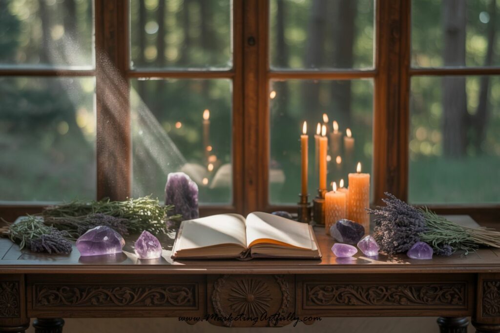 • Candles with intention (e.g. new moon, protection, manifestation)